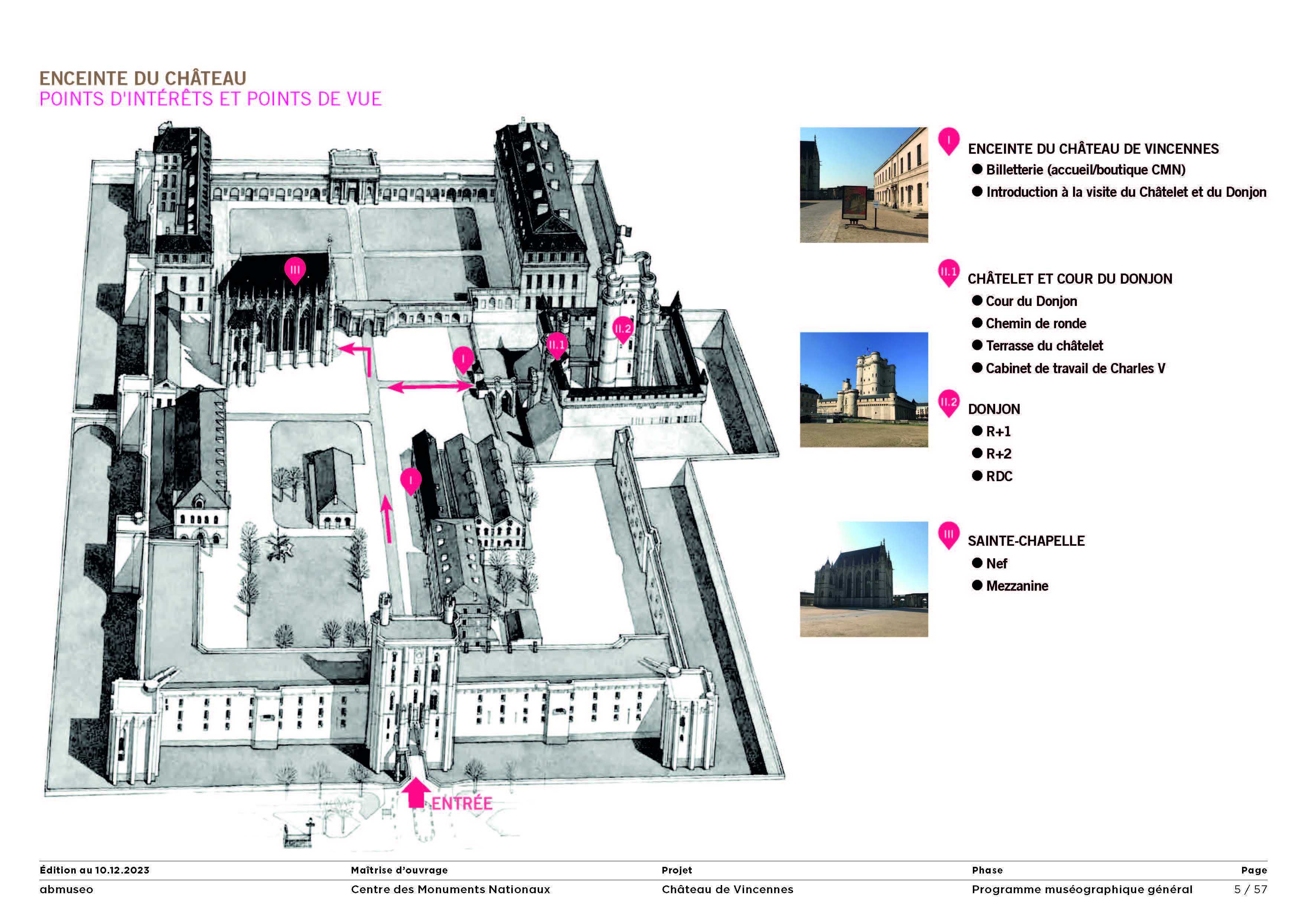 L'étude concerne la programmation du futur parcours permanent du château de Vincennes qui doit emmener les visiteurs des recoins du donjon jusqu’aux remparts et à la magnifique chapelle gothique flamboyant. Au programme de la mission s’ajoute la conception d'un nouvel espace d’interprétation qui retrace l’histoire du monument, ainsi que des dispositifs de médiation pour jalonner la visite patrimoniale.