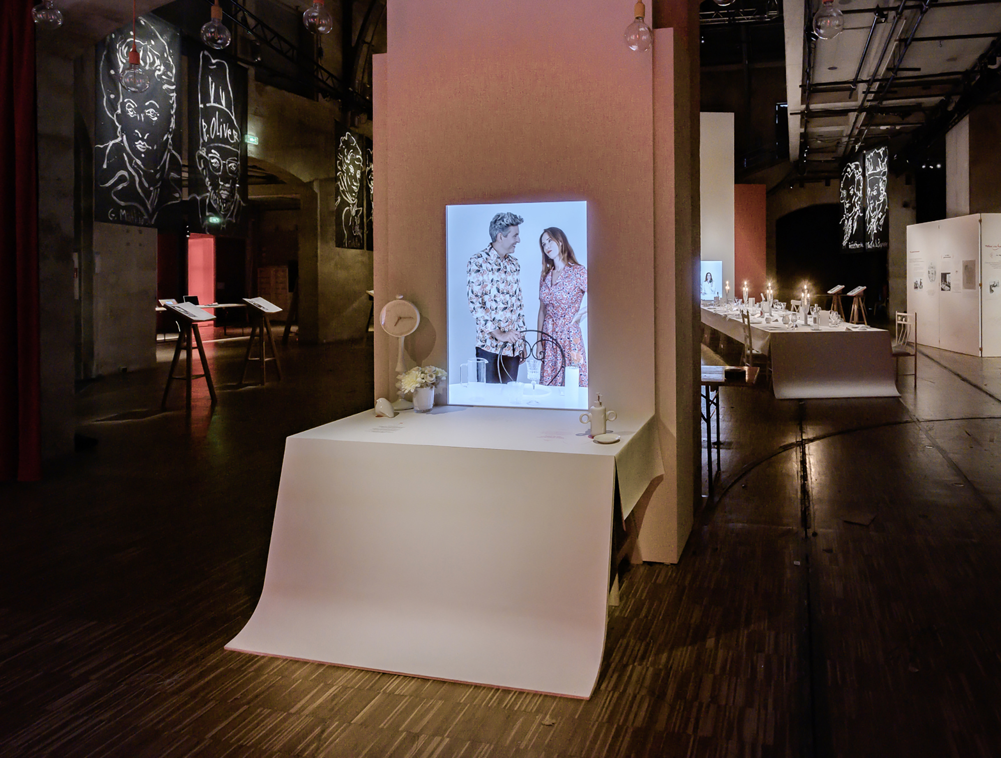 La scénographie invite les visiteurs à passer à table. Le dispositif déploie dans l’espace de grandes nappes blanches qui se retournent verticalement et présentent les aventures audiovisuelles des “mimes mangeurs”. Visuellement frappants, avec un travail précis de stylisme, d’accessoires et de gestuelle, ces saynètes mettent en scène deux mîmes qui vont braver les codes de la gastronomie, en les exagérant pour faire surgir leur pouvoir comique. Les quatre grandes étapes de l’exposition sont ainsi déclinées par une série d’attitudes cocasses que les personnages vont adopter. Le sabrage du champagne devient alors épique, la dégustation du vin une étape surréaliste, le choix des légumes une étrange chorégraphie...