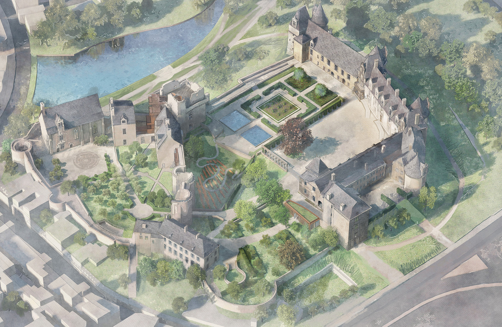 Le château de Châteaubriant, site patrimonial majeur, est une unité culturelle où la petite histoire éclaire la grande. L’enjeu de ce parcours de visite consiste à créer des liens entre les espaces et les temporalités, du Moyen Âge à nos jours. Le projet scénographique se fonde sur trois axes : l’utilisation de modes de représentations picturales empruntés au Moyen Âge et à la Renaissance, une mise en récit incarnée par différents personnages, des publics invités à devenir acteurs de leur visite.
