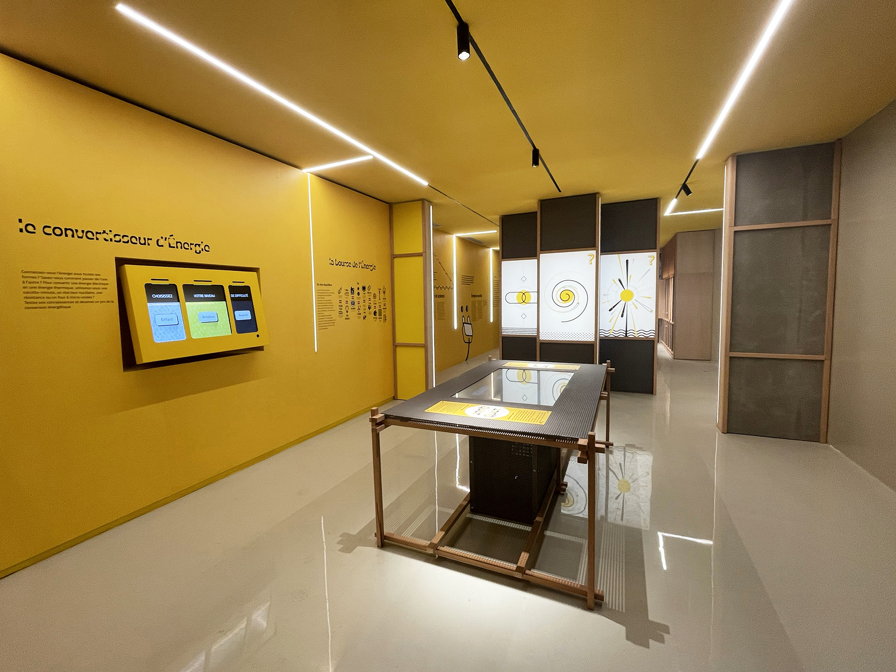 La visite se décompose en deux temps. Le premier espace, narratif et contemplatif, a un rôle d’introduction aux grands concepts. Le deuxième, implanté au sein de l’ancienne chaufferie, aborde les différentes formes que prennent l’énergie et les dispositifs d’ingénierie qui en permettent la transformation par de nombreuses manipulations.