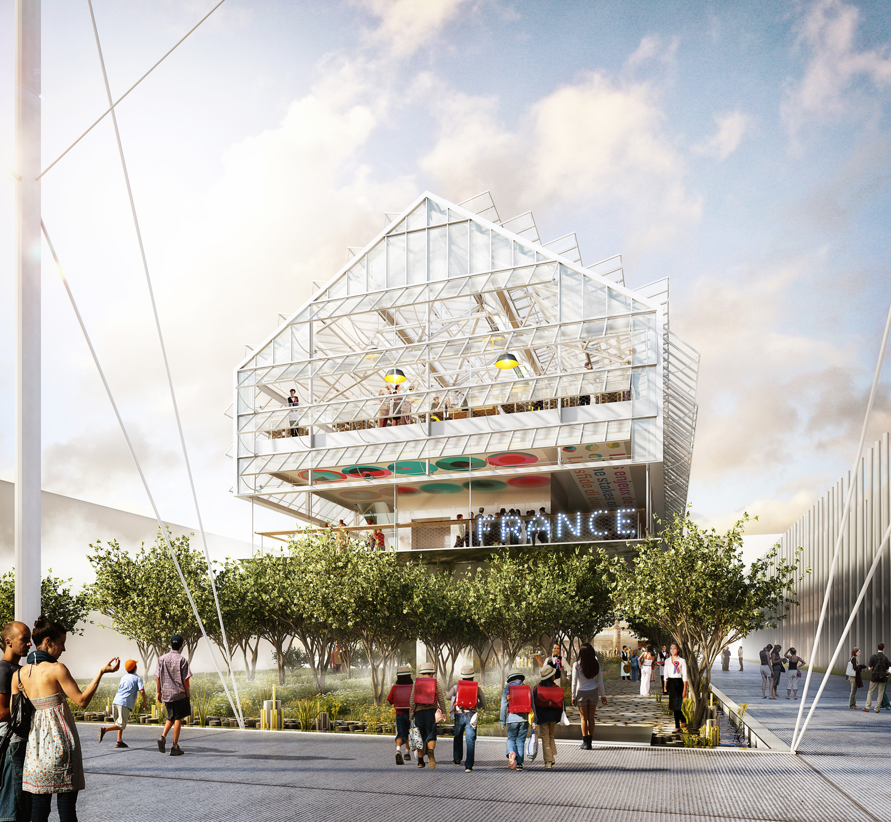 Dans cette proposition qui concilie sur un même espace toutes les dimensions de l’écosystème humain, l’exposition s’insère comme un temps de réflexion, un espace propice au déploiement des idées. Surplombant le jardin et son sol nourricier, le pavillon évoque une serre qui «vole» et invite à prendre de la hauteur pour mieux considérer la question posée, “comment nourrir neuf milliards d’habitants en 2015 ?”. La réponse pourrait se résumer ainsi : travailler à l’équilibre entre quantité et qualité.