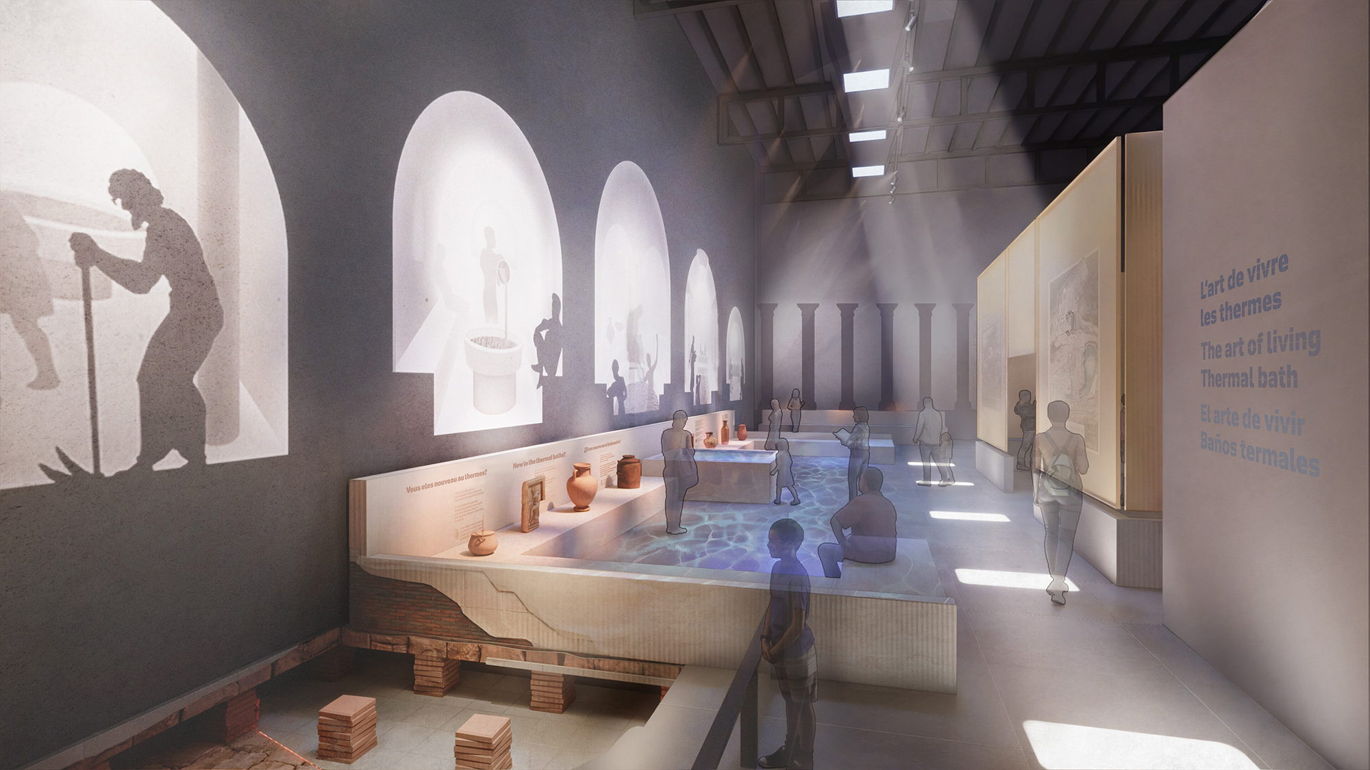 En orchestrant la signalétique qui agrège les fragments à chacune des échelles du projet, la lumière pour scénographier des intérieurs/extérieurs et suggérer des bâtis, les dispositifs audiovisuels narratifs sur la maitrise et la préservation de l’eau et une proposition paysagère qui s’immisce dans les espaces intérieurs, le projet propose au final une visite kaléidoscopique pour rendre compte de la complexité technique de la construction et de l’inventivité de la civilisation romaine.