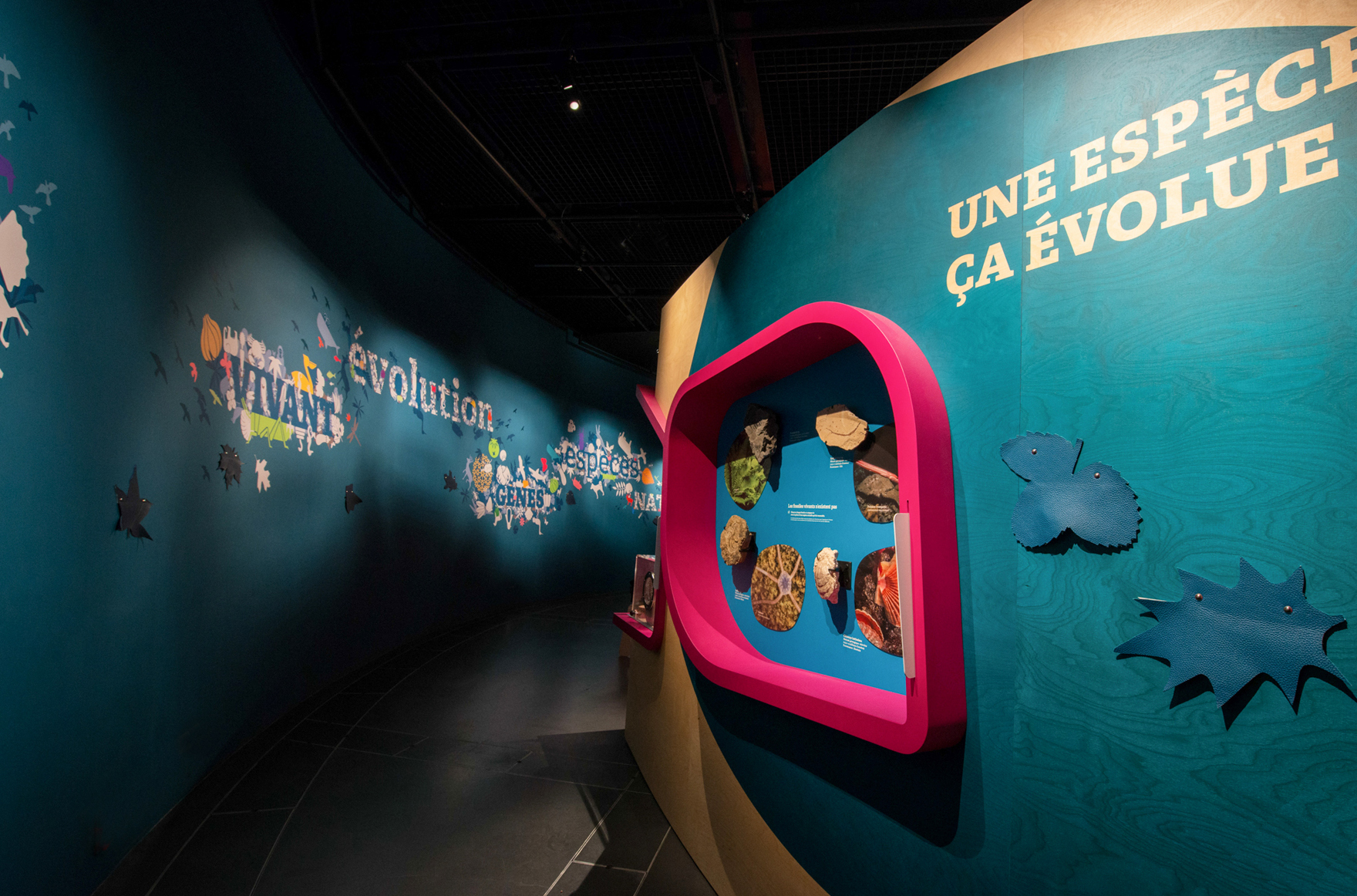 Tous les éléments scénographiques - la fresque graphique du vivant en périphérie de la salle, la cohorte des animaux disparus au cœur de l’espace et les cinq ilots thématiques supports des contenus et des manipulations- se répondent pour offrir une visite que tous les publics peuvent s’approprier.